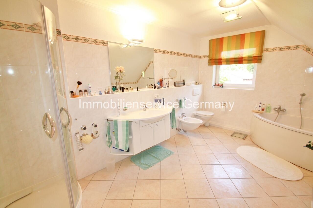 Oasis de bien-être avec confort : salle de bain spacieuse avec baignoire et douche, design sans seuil et meuble sous lavabo pratique